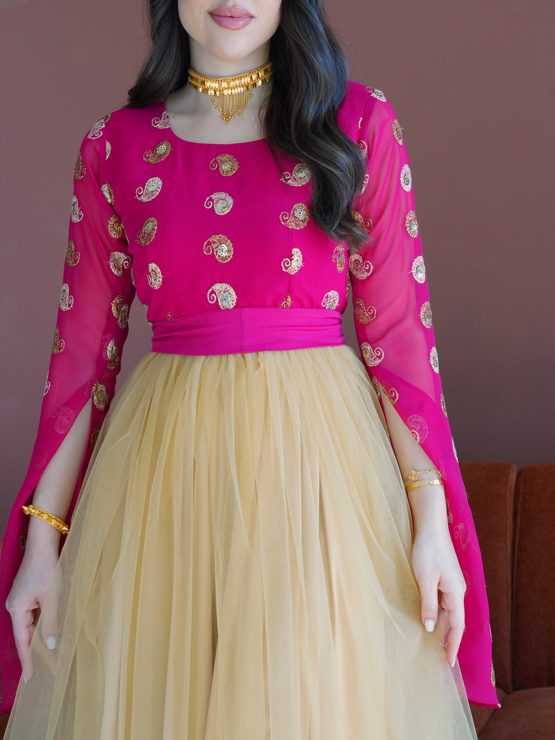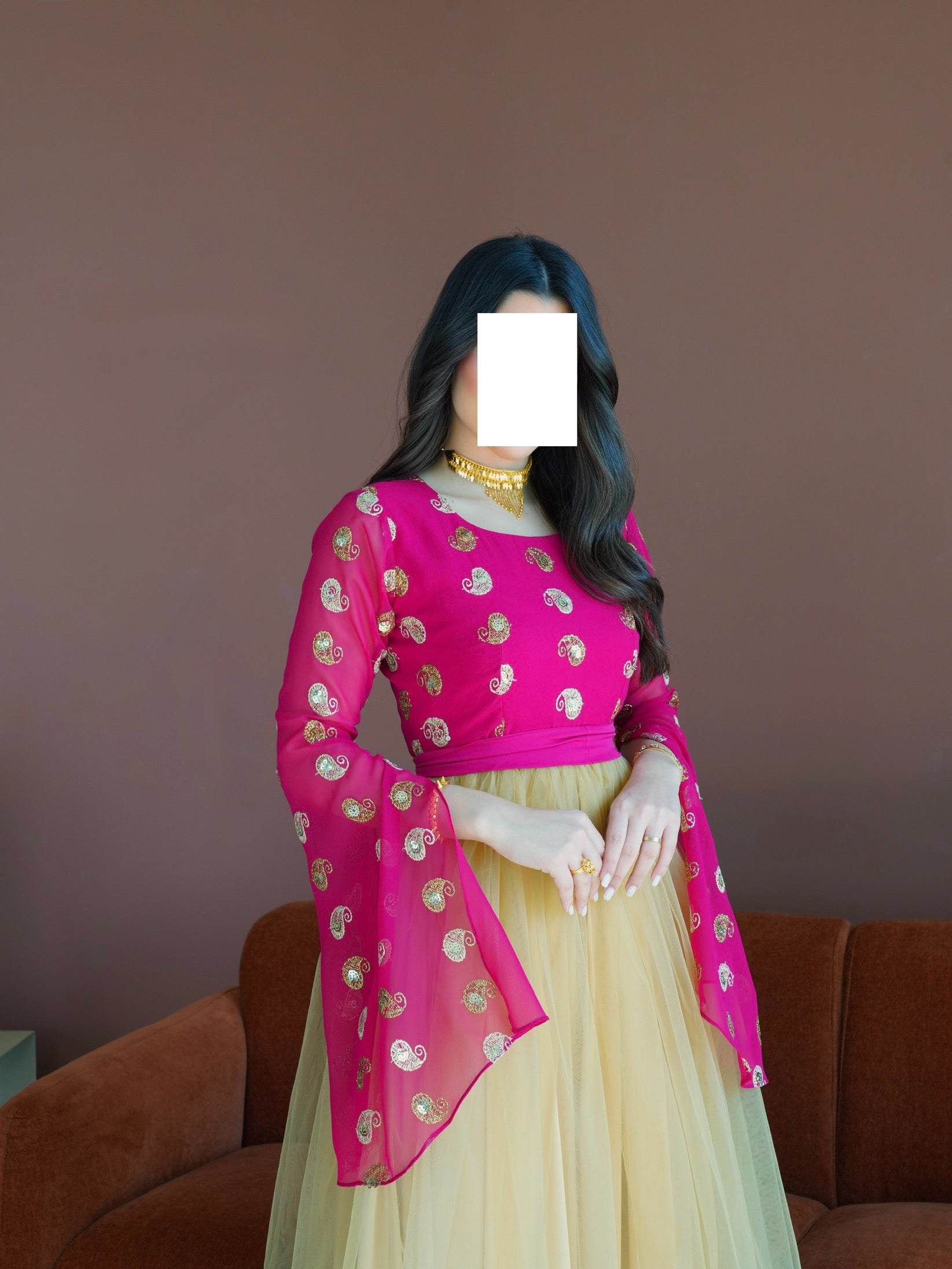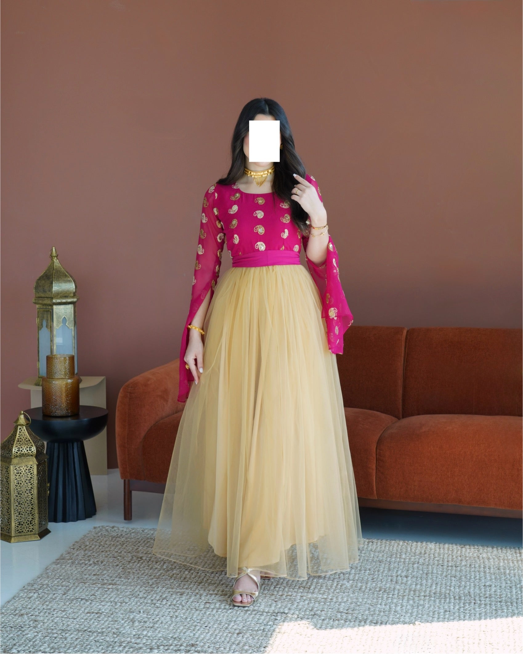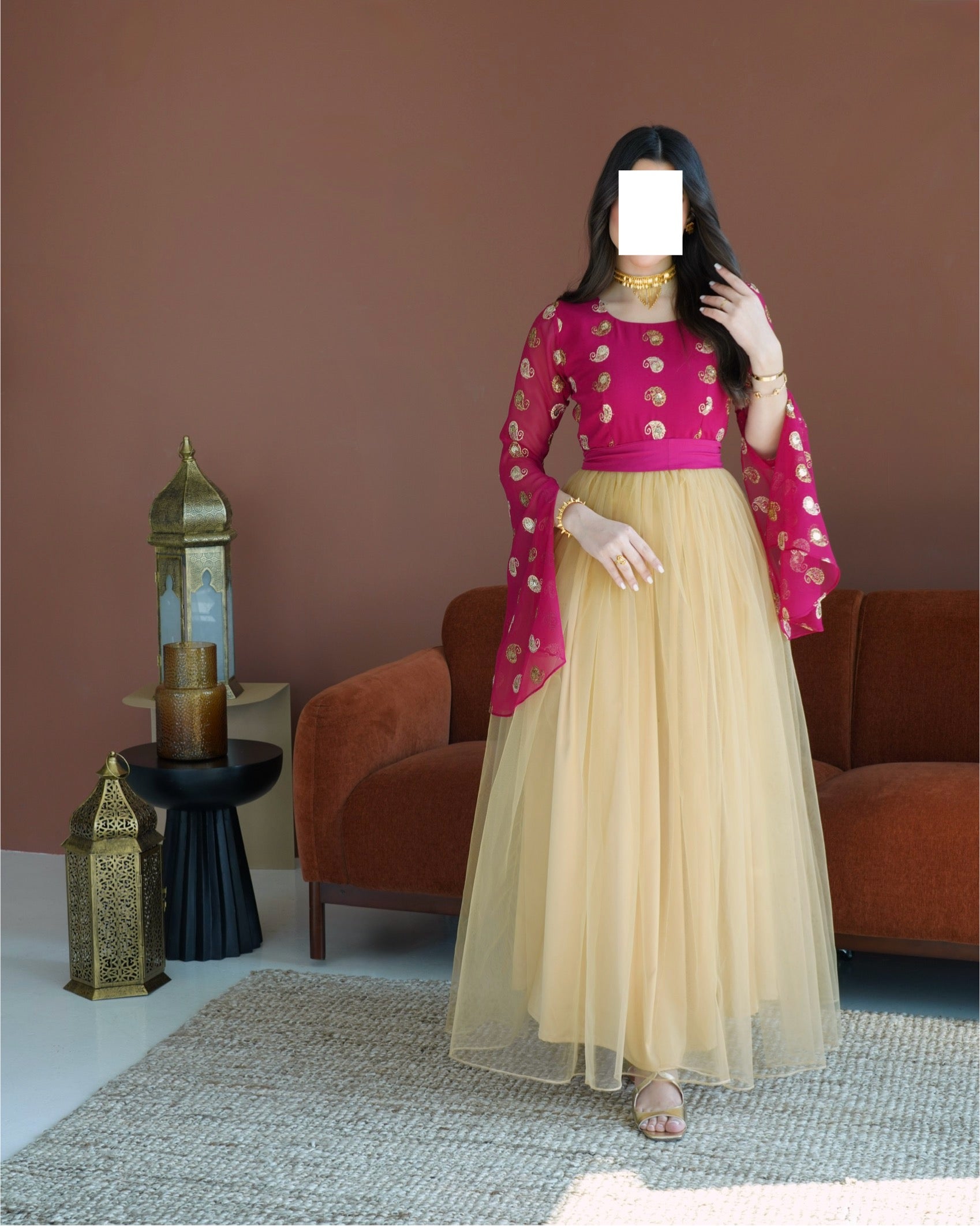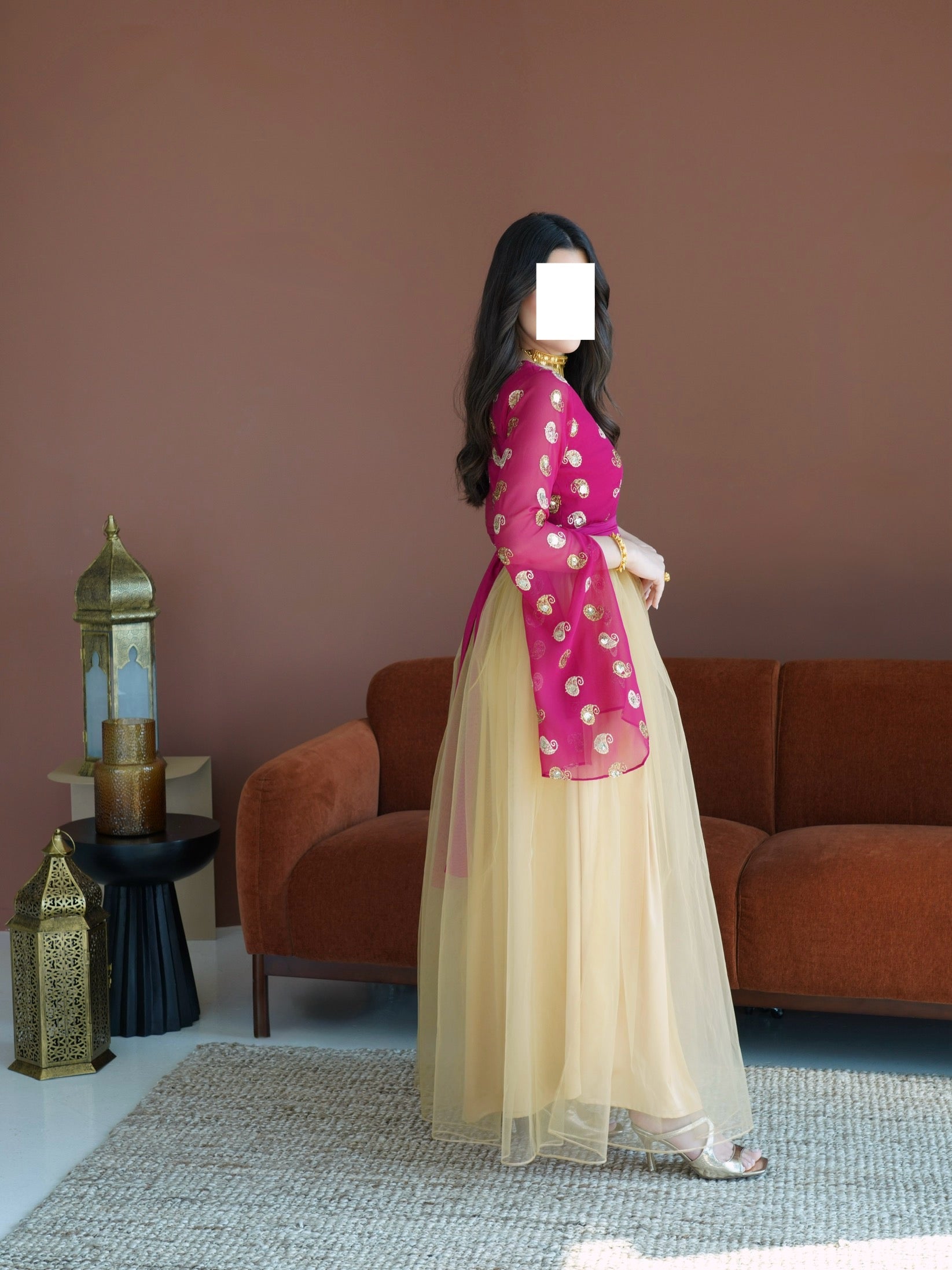 يجمع بين الشيفون المطرز والتور الناعم مع حزام الخصر