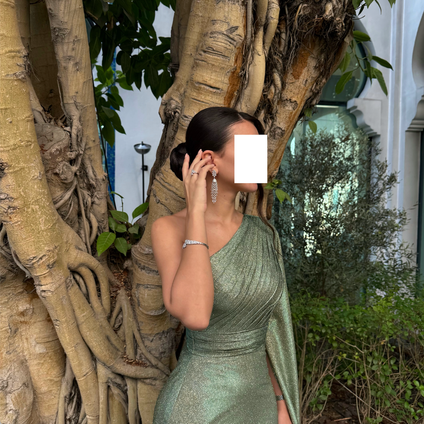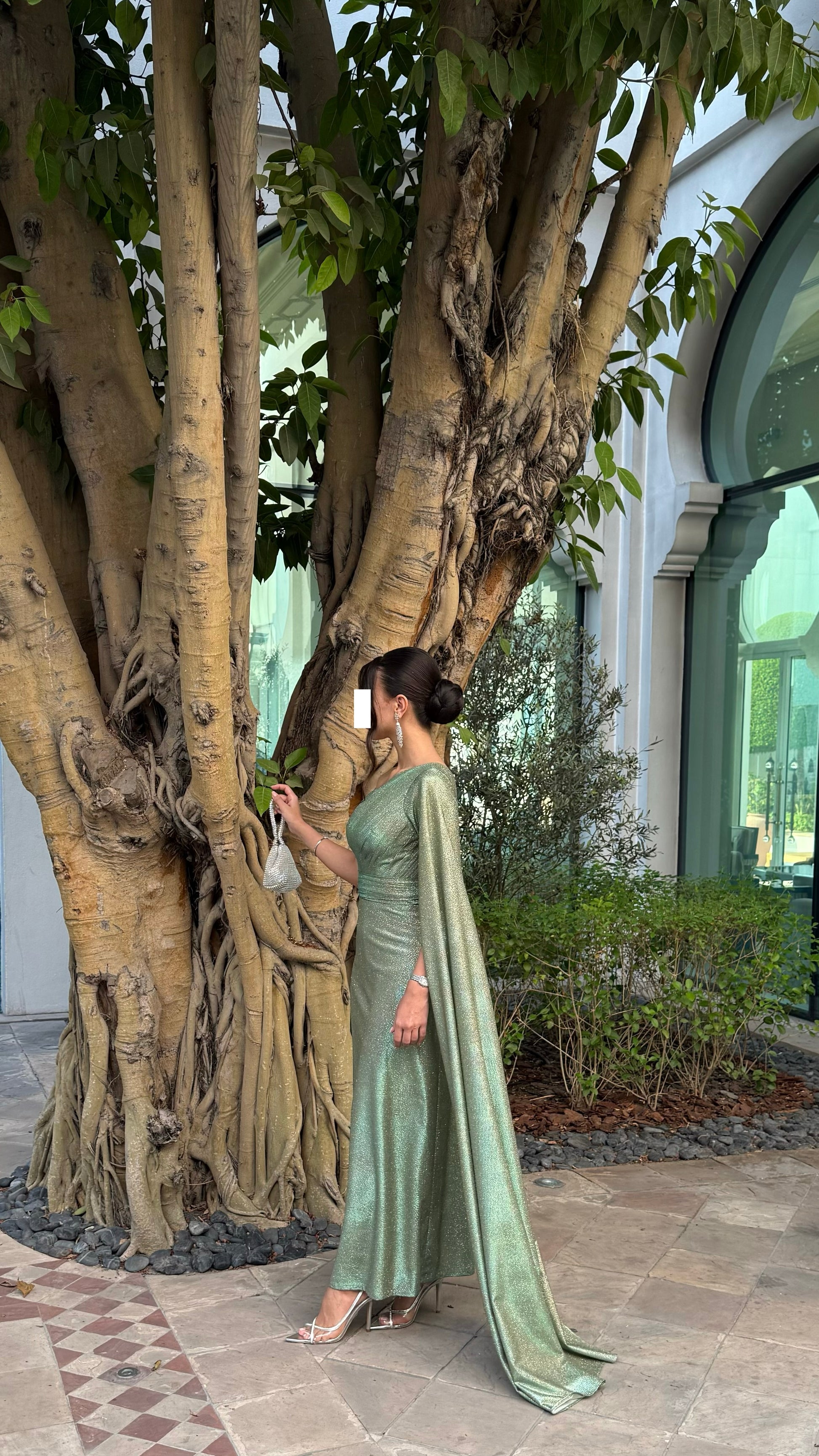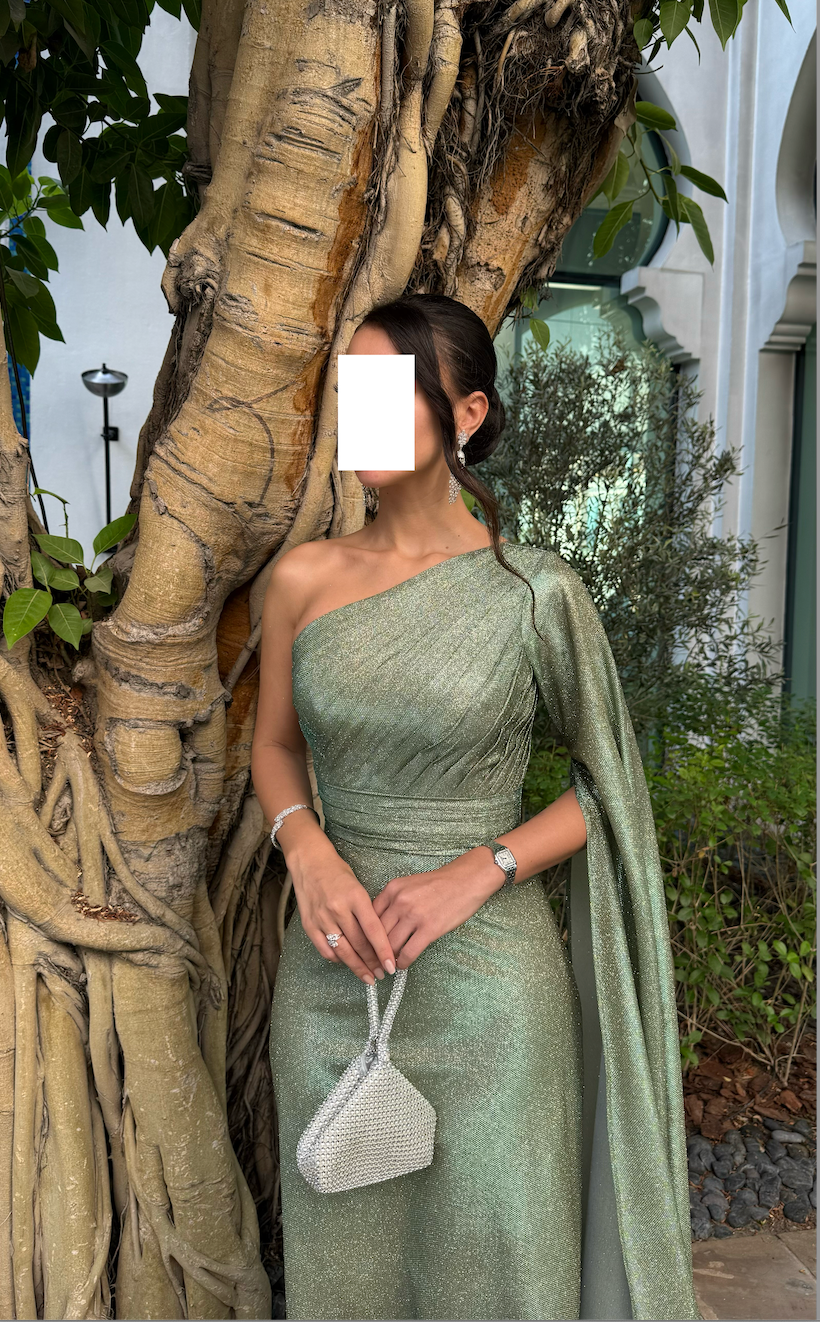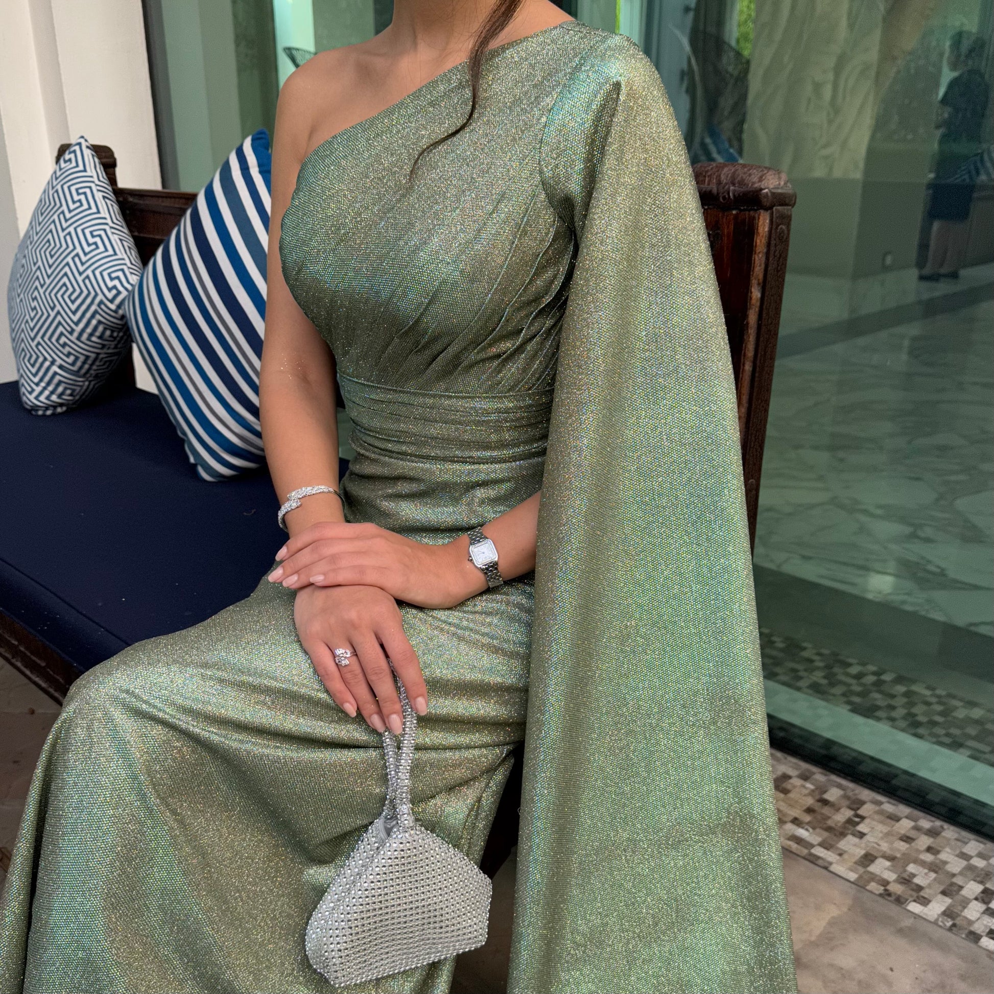 فستان لامع مخصر بكسرات مميزة على الصدر باللون الأخضر مصنوع من قماش كريب فاخر، يتميز بتصميمه العصري وحركة الكتف الطويلة التي تضيف لمسة جذابة وانسيابية