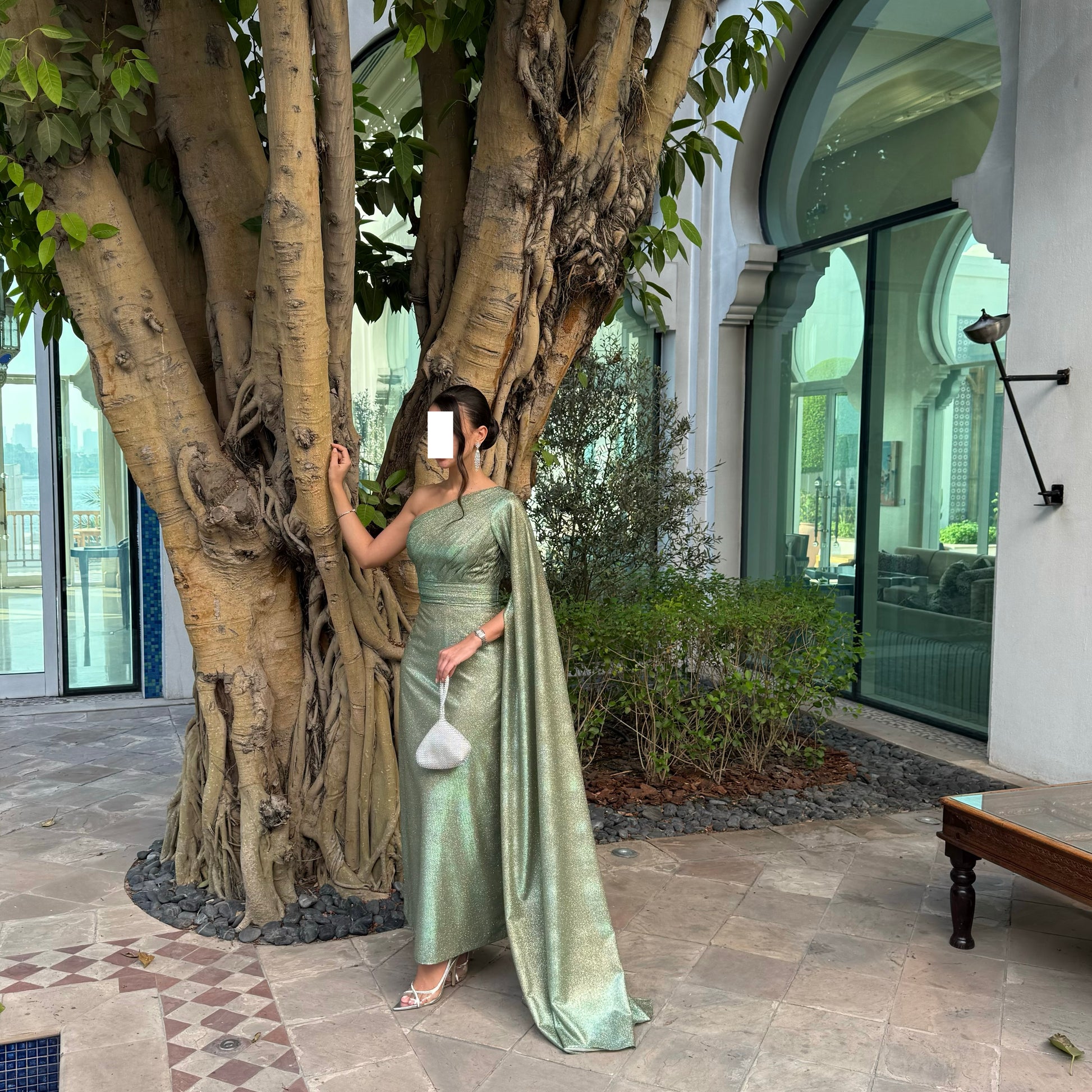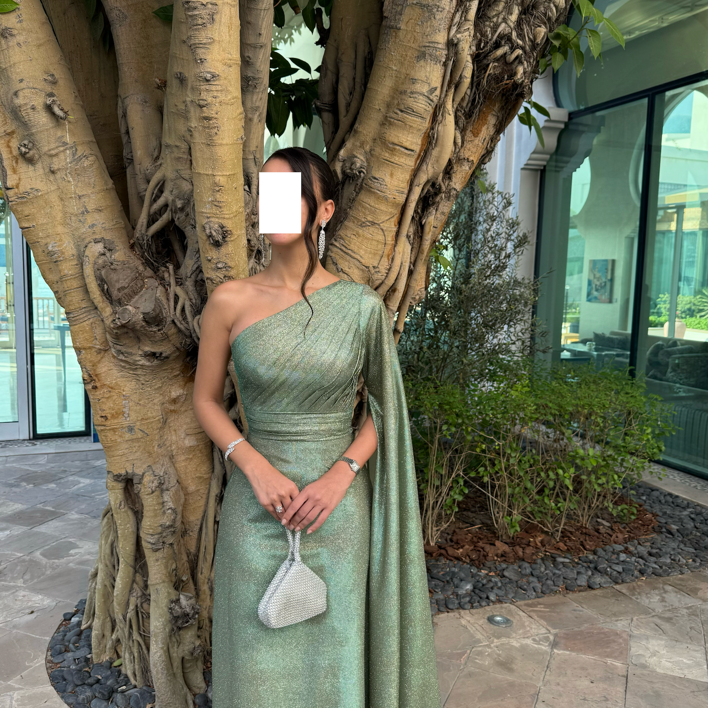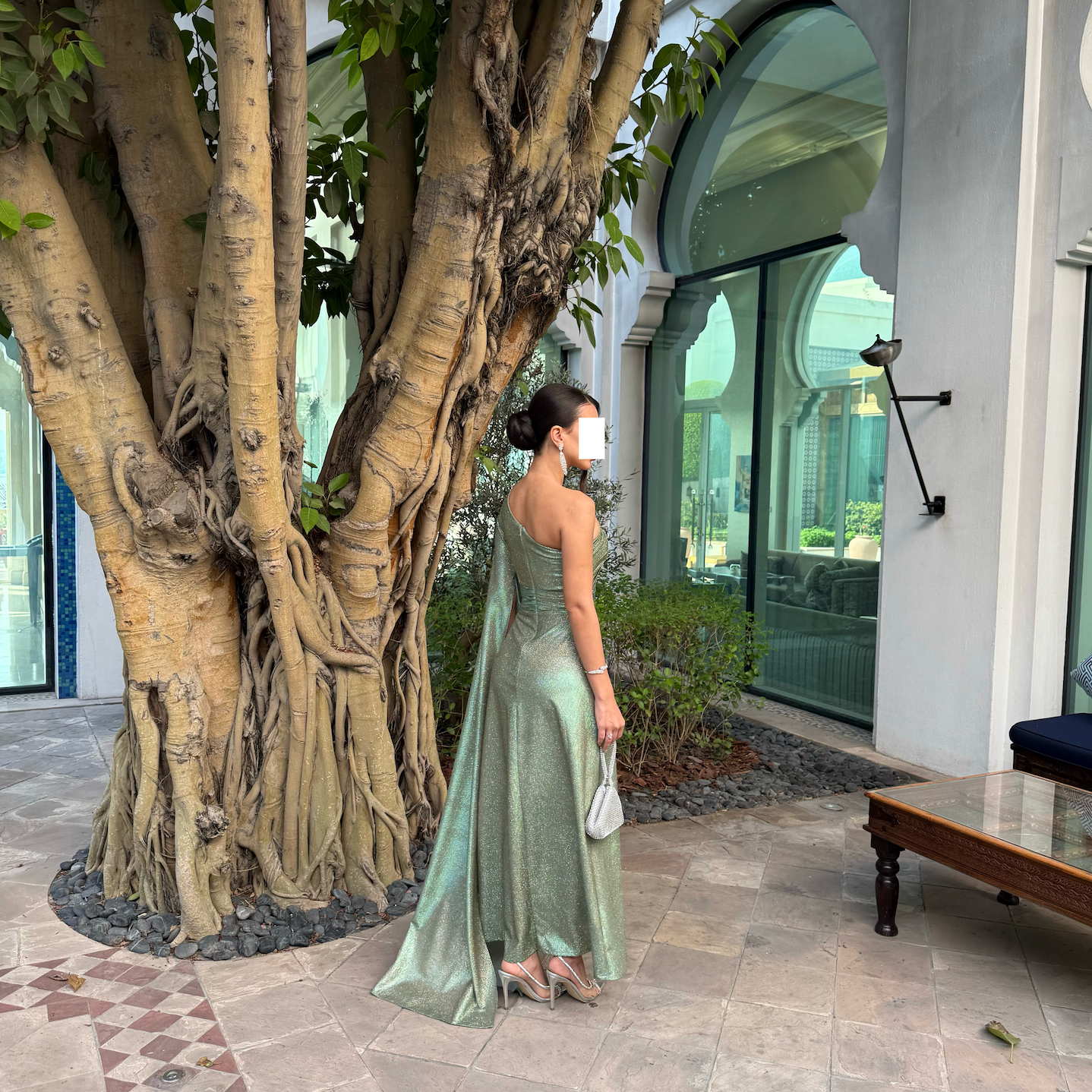 فستان لامع مخصر بكسرات مميزة على الصدر باللون الأخضر مصنوع من قماش كريب فاخر، يتميز بتصميمه العصري وحركة الكتف الطويلة التي تضيف لمسة جذابة وانسيابية