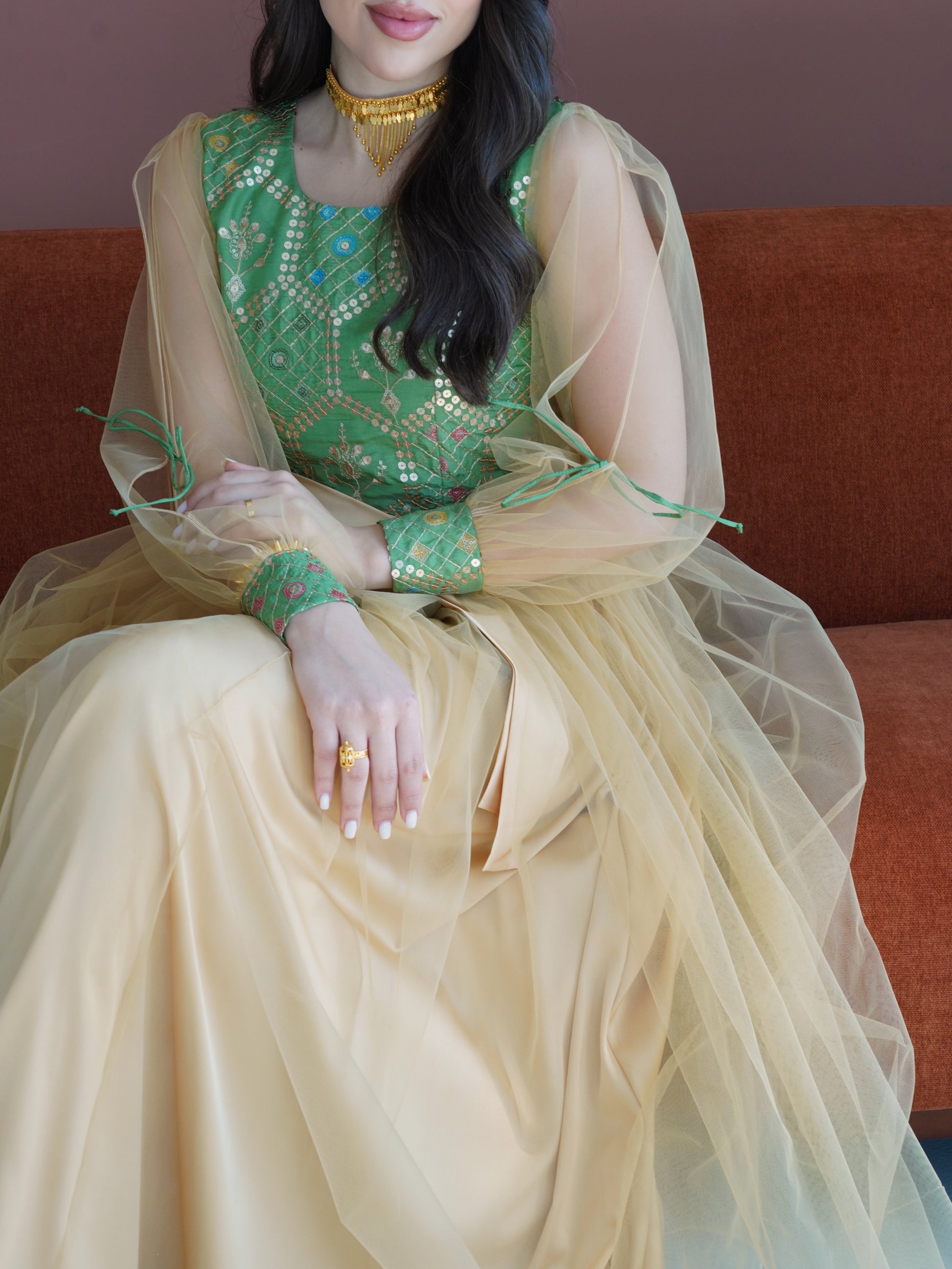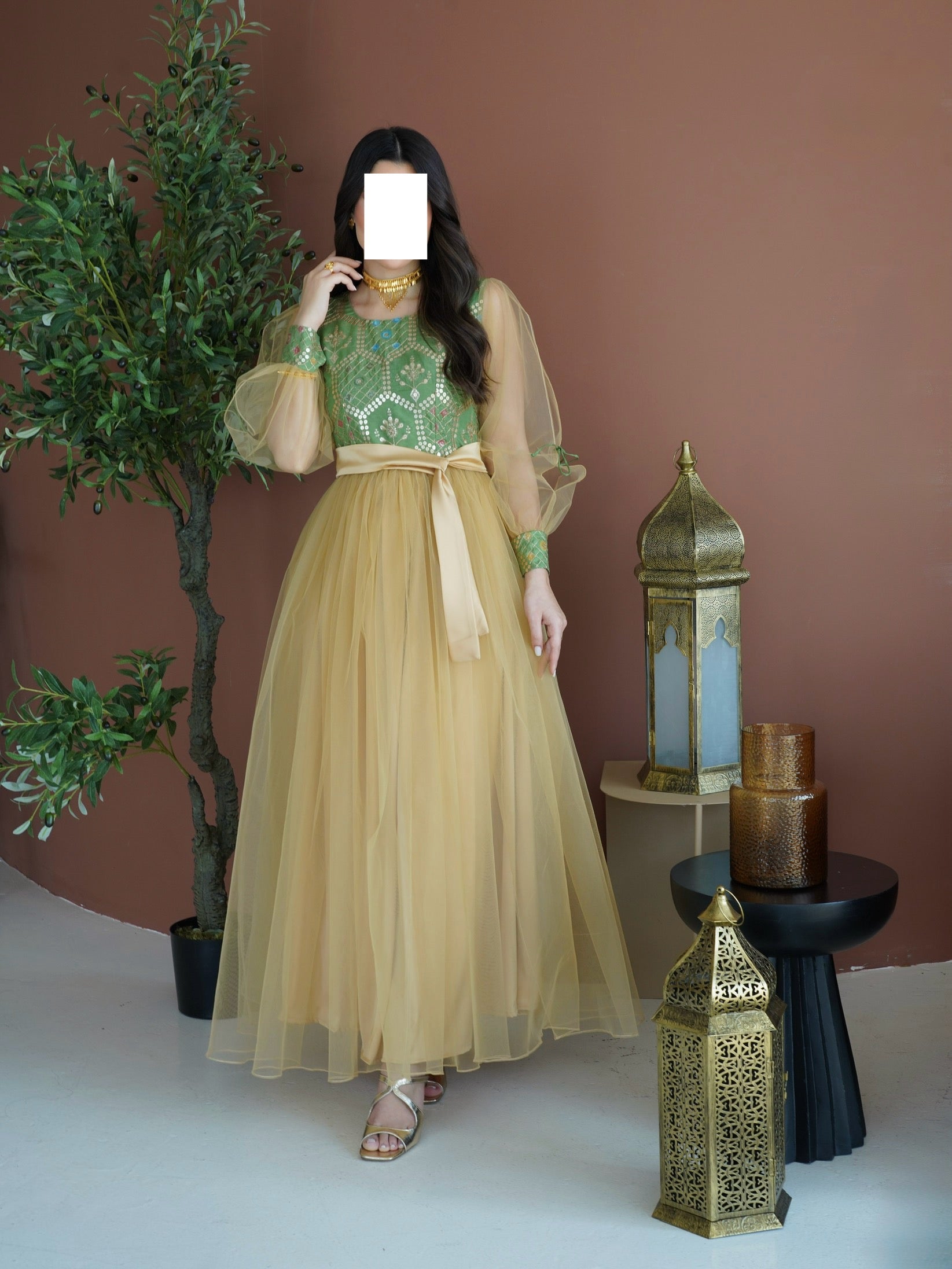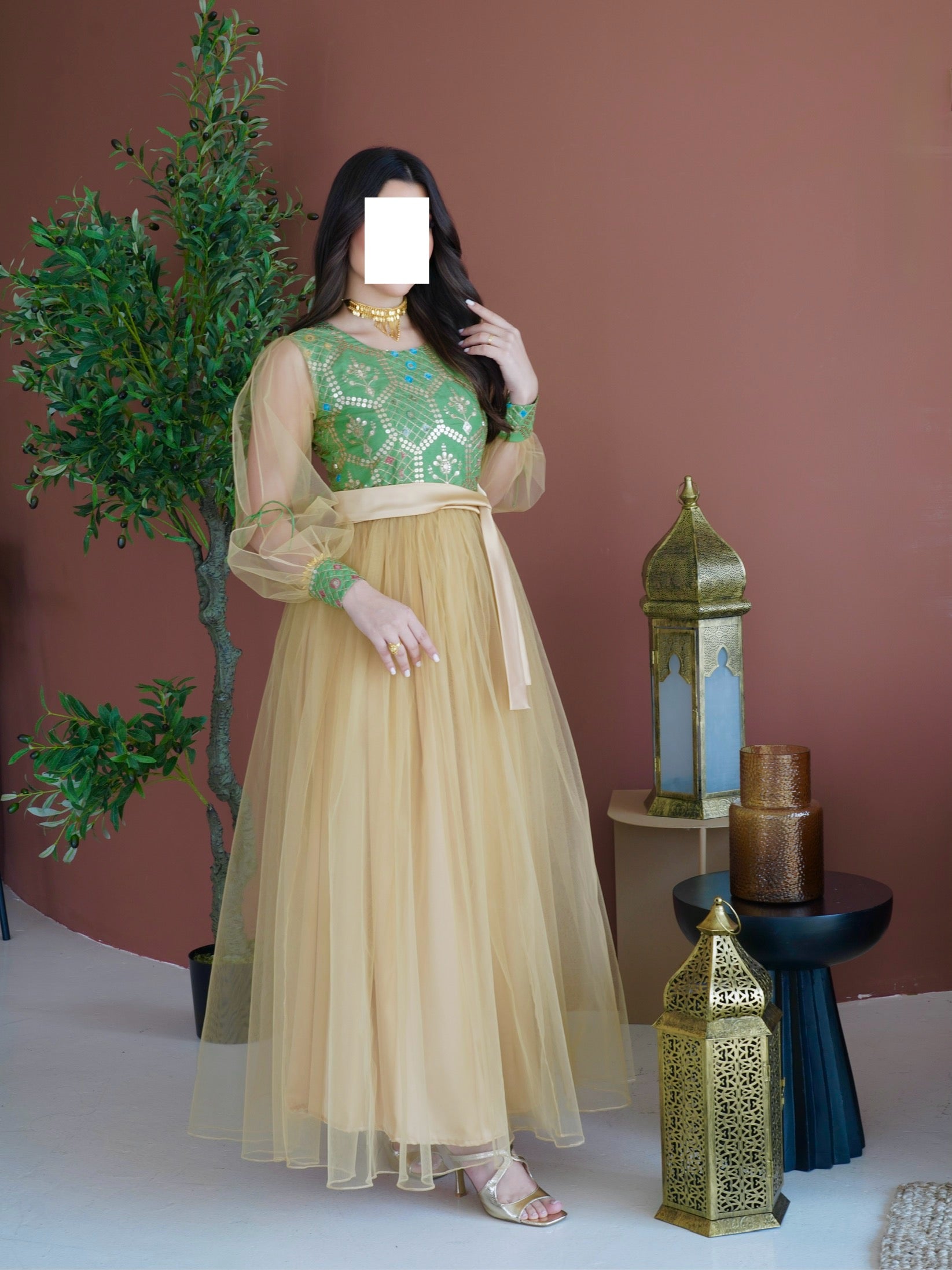 يجمع بين الحرير الهندي المطرز والتور الناعم ويزين مع حزام