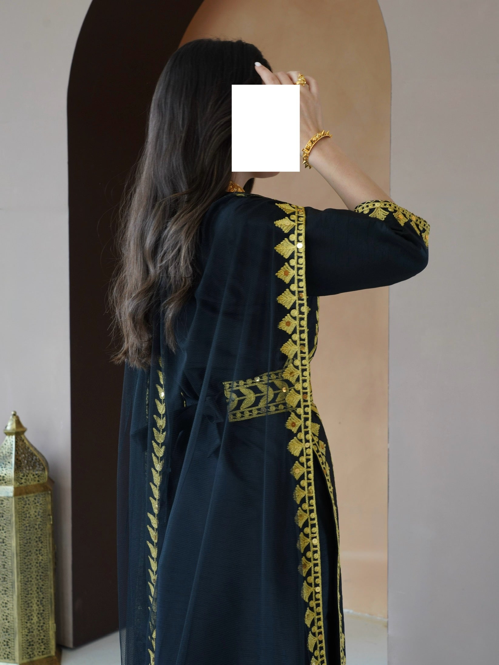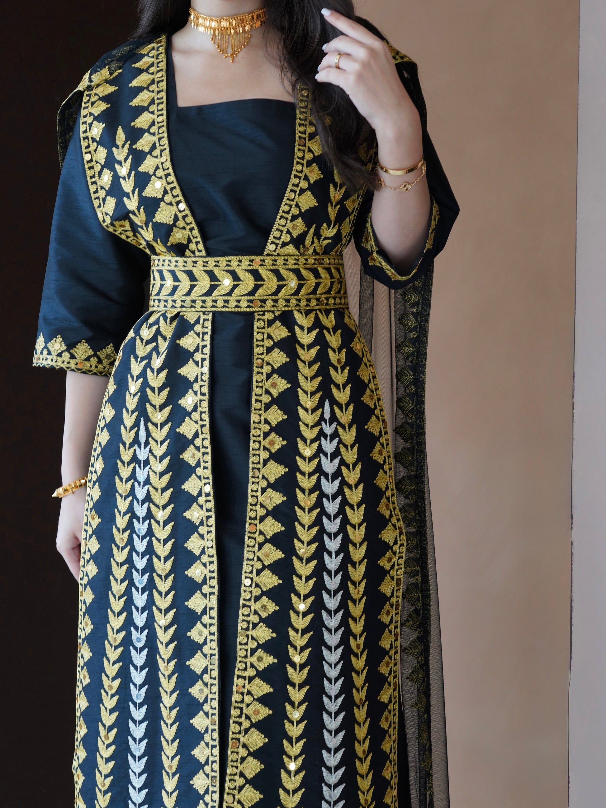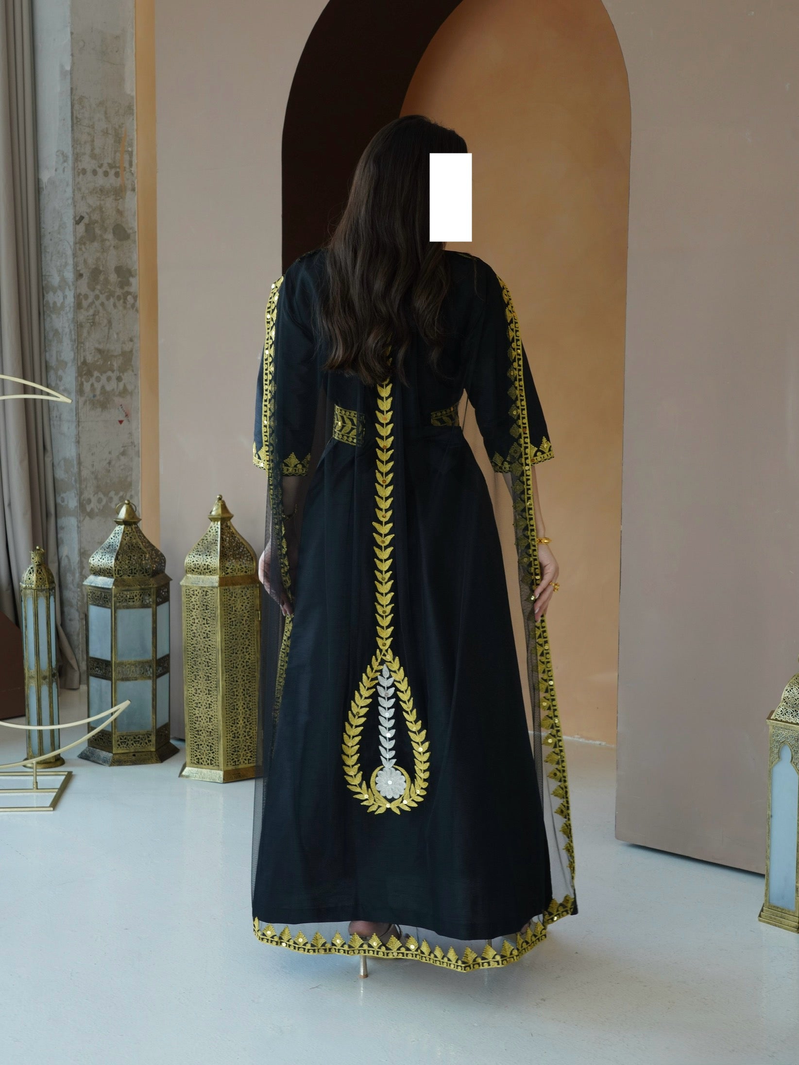 فستان نور مصنوع من الحرير الهندي والتور مطرز بخيوط ذهبيه وفضية مكون من 3 قطع دريس + بشت + حزا