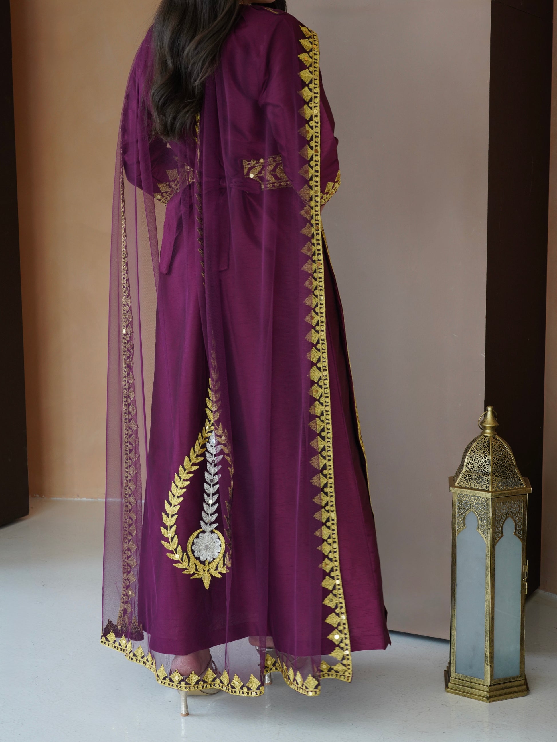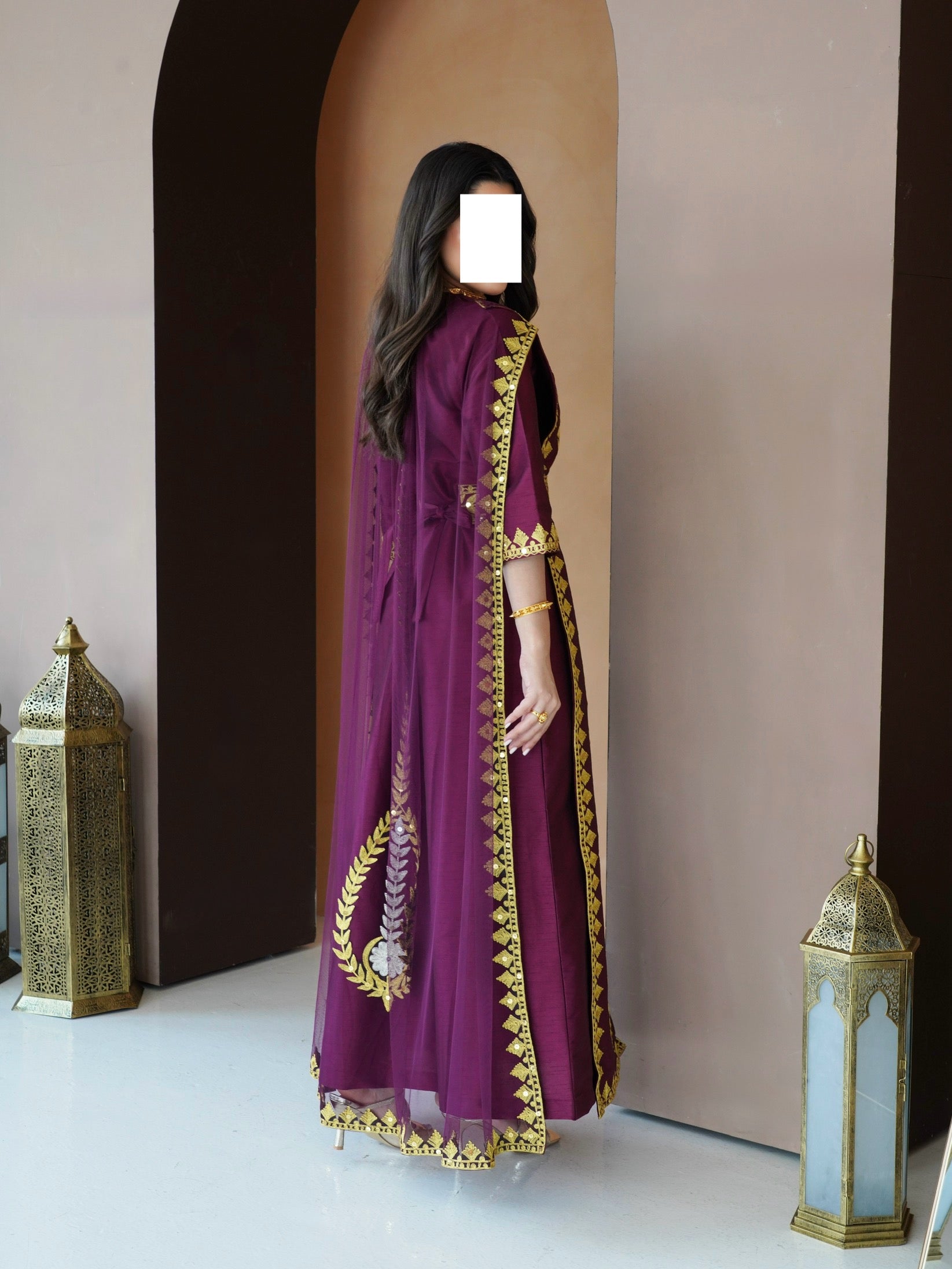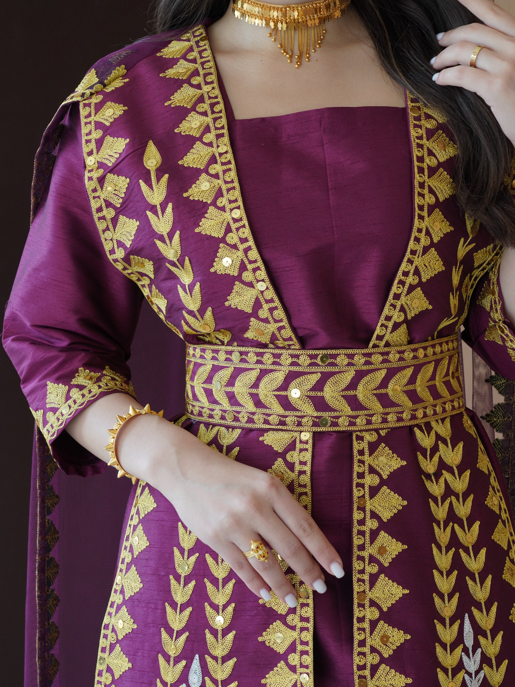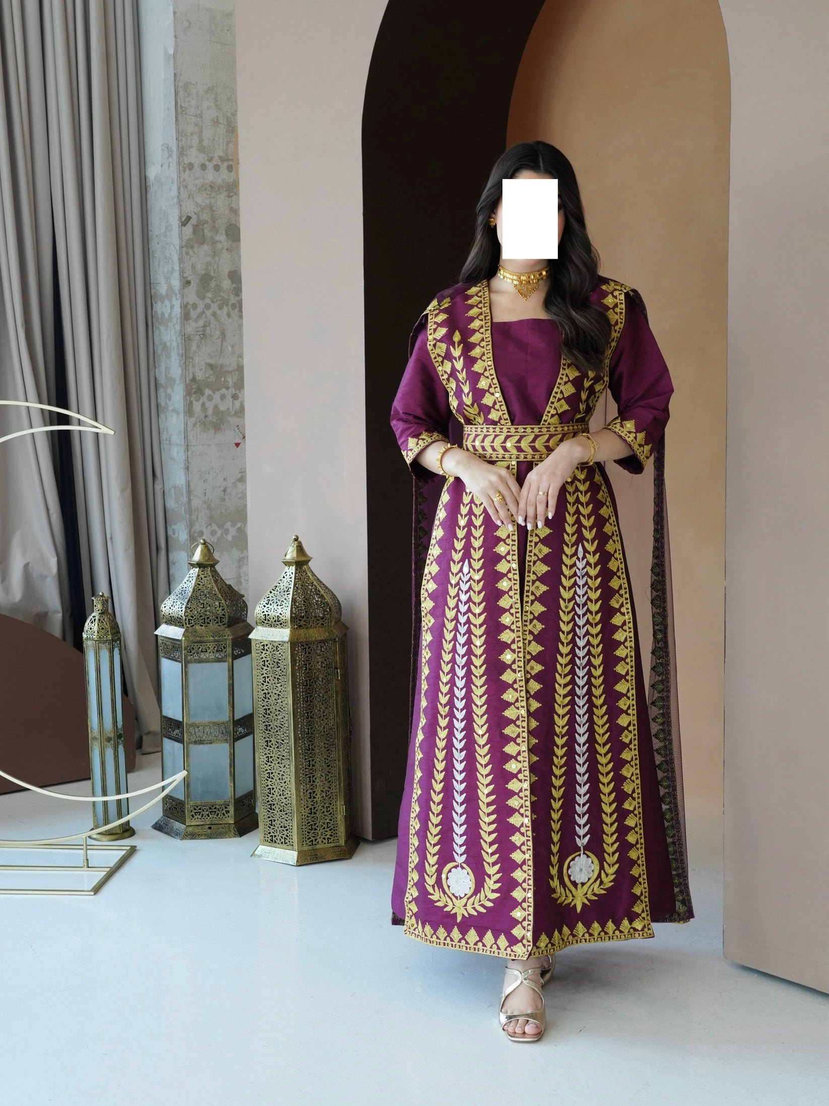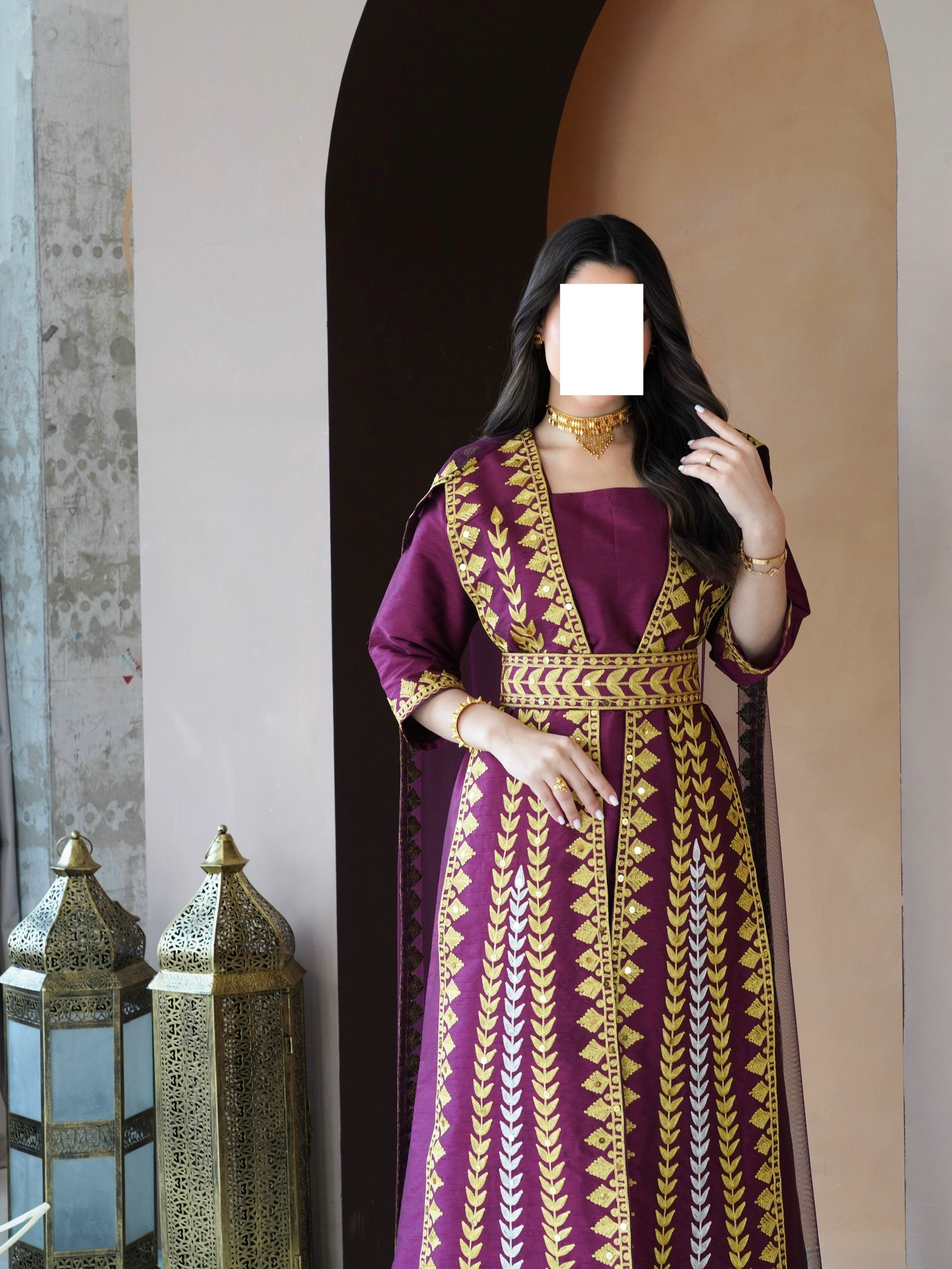 فستان نور مصنوع من الحرير الهندي والتور مطرز بخيوط ذهبيه وفضية مكون من 3 قطع دريس + بشت + حزام