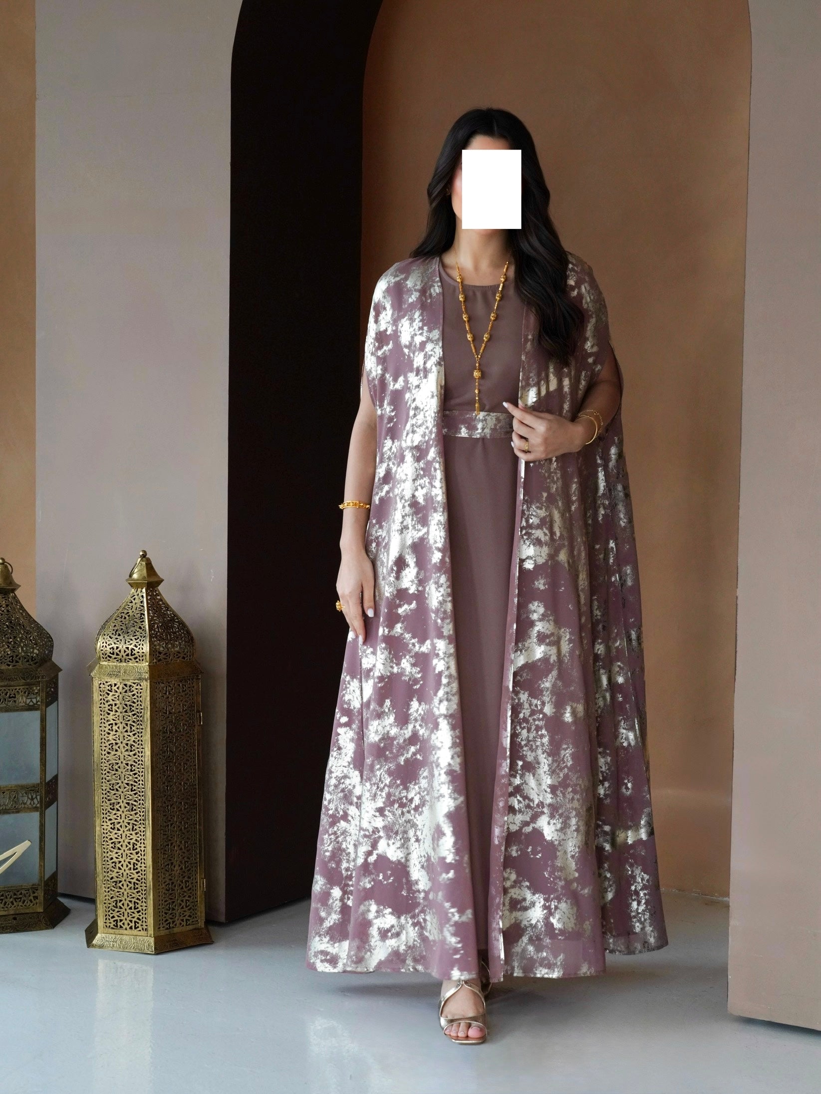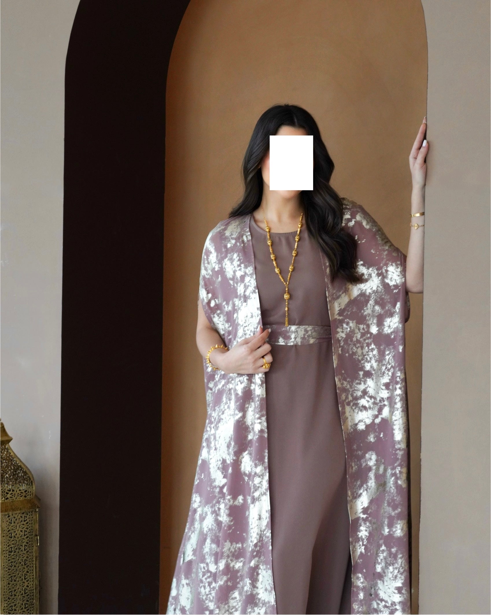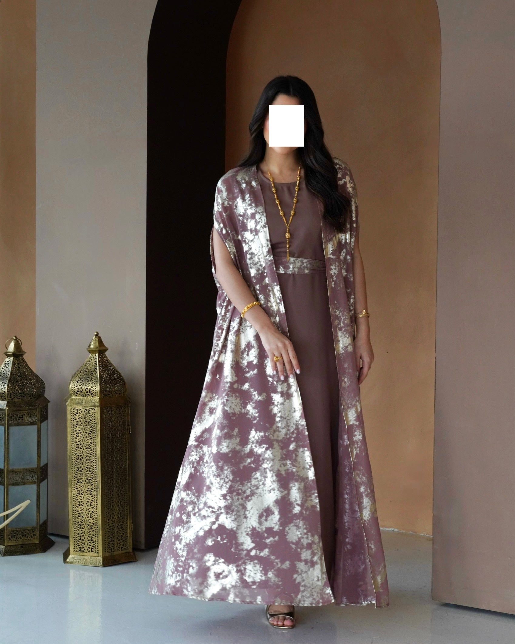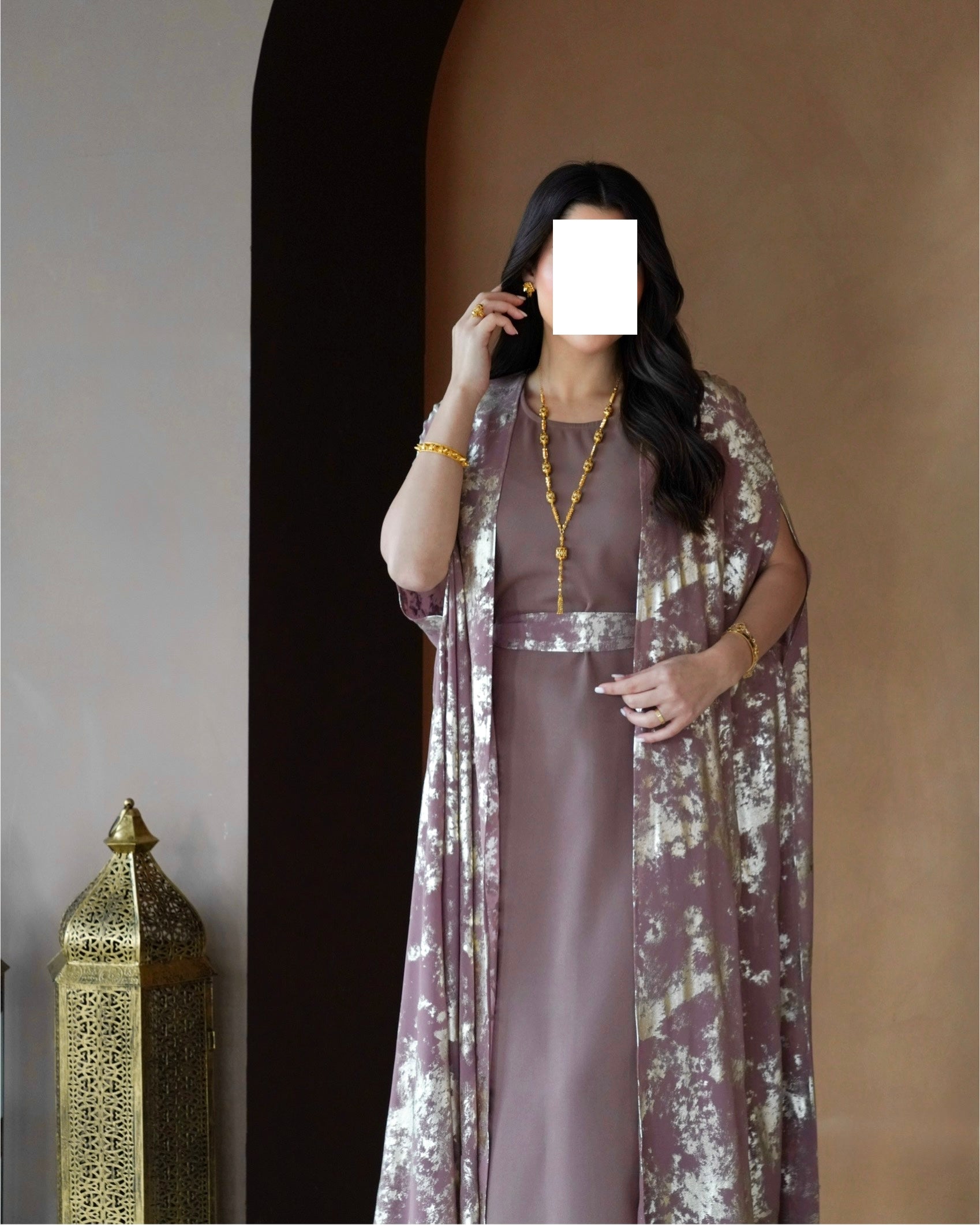 فستان فري سايز بمزيج من الباربي الفاخر والشيفون بطبعات ذهبية مكون من ٣ قطع درس +كيب+حزام
