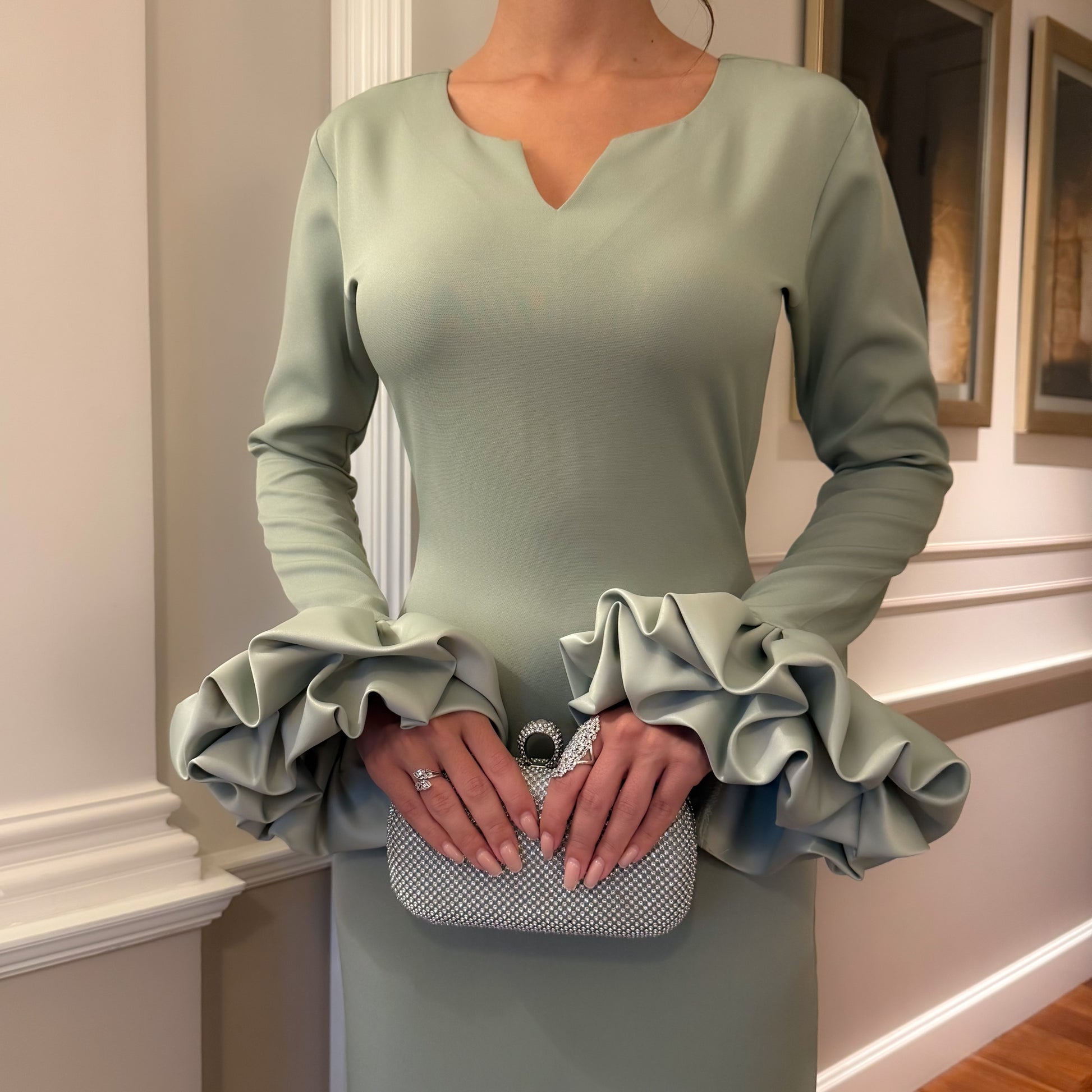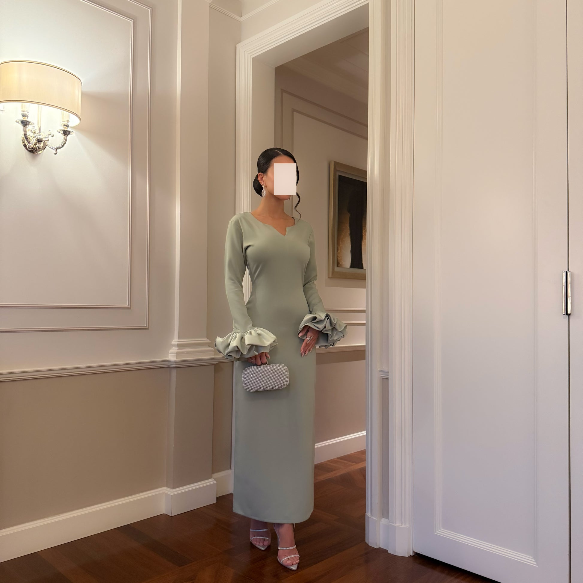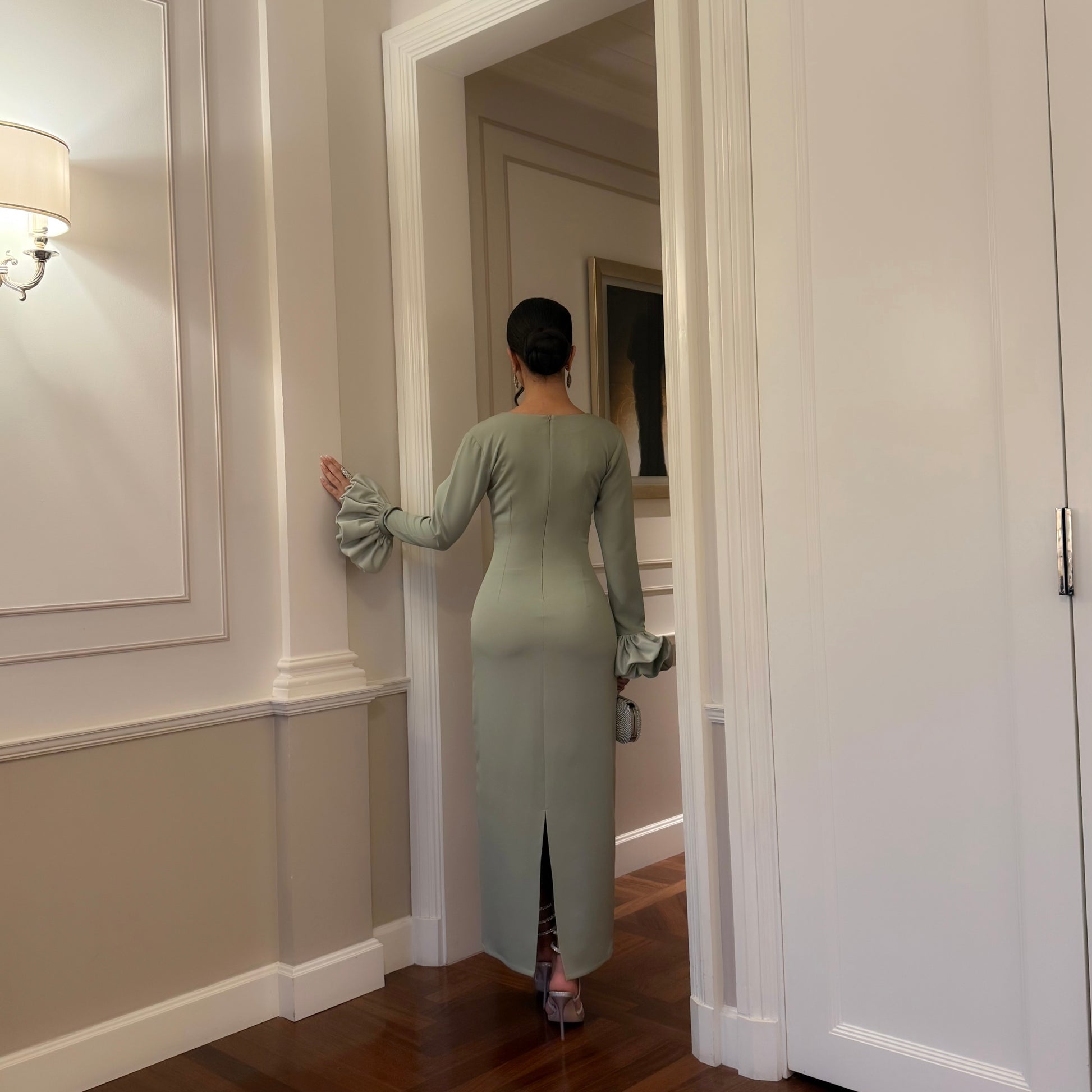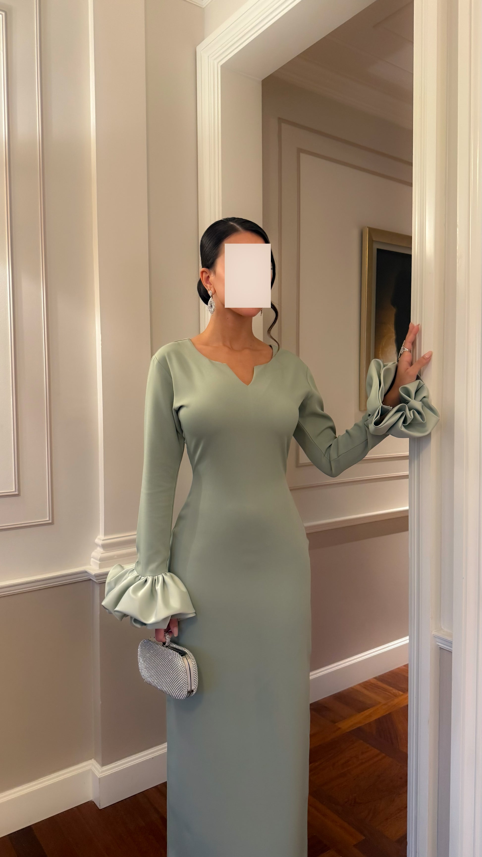 فستان طويل أنيق بقَصّة خصر ناعمة يُبرز خطوط الجسم بانسيابية، مطرّز بلون أخضر ماتشا هادئ يمنح إطلالة راقية ومتجددة. يتميّز بأكمام طويلة تنتهي بتفاصيل كشكش واسعة تضيف حركة وحيوية خفيفة مع كلّ حركة