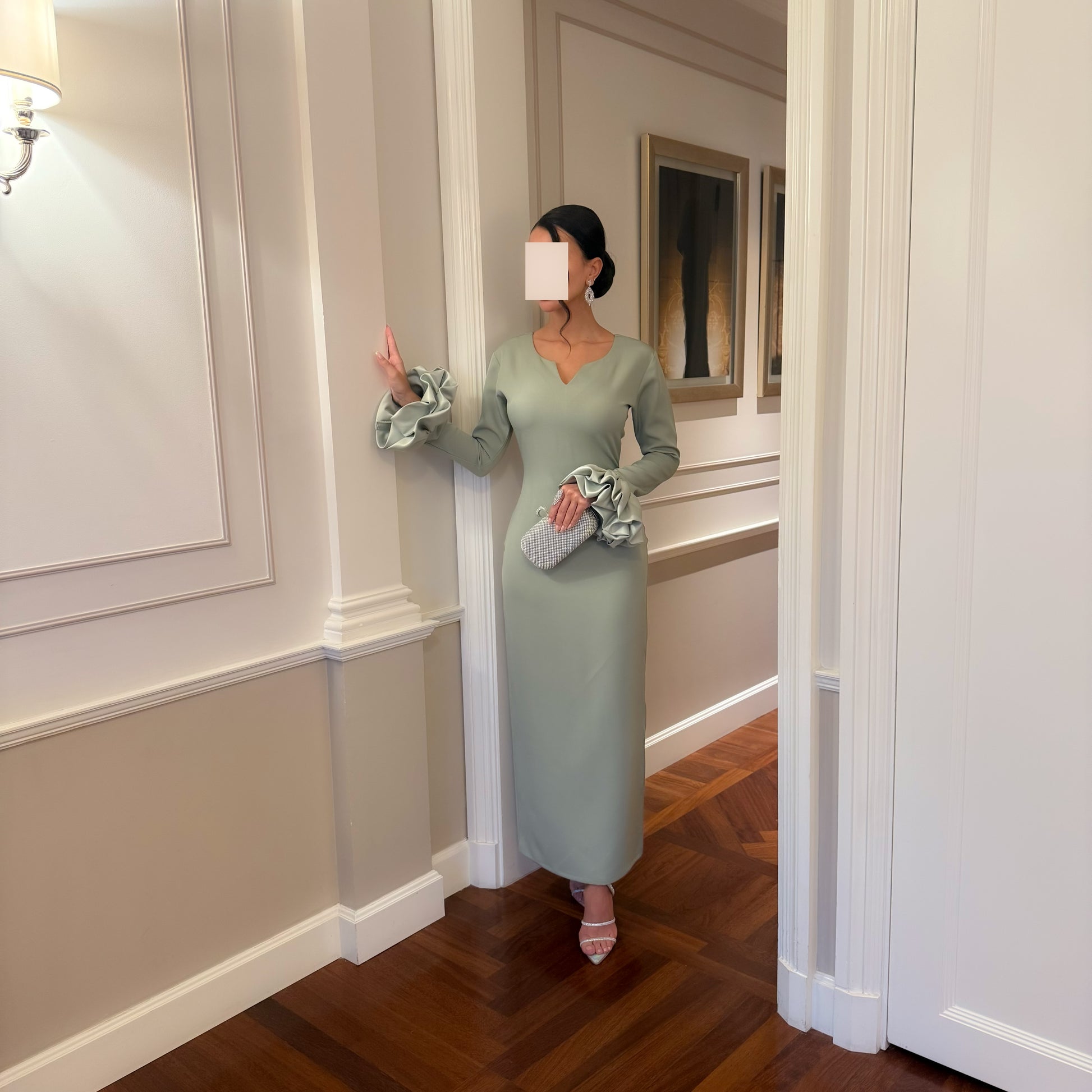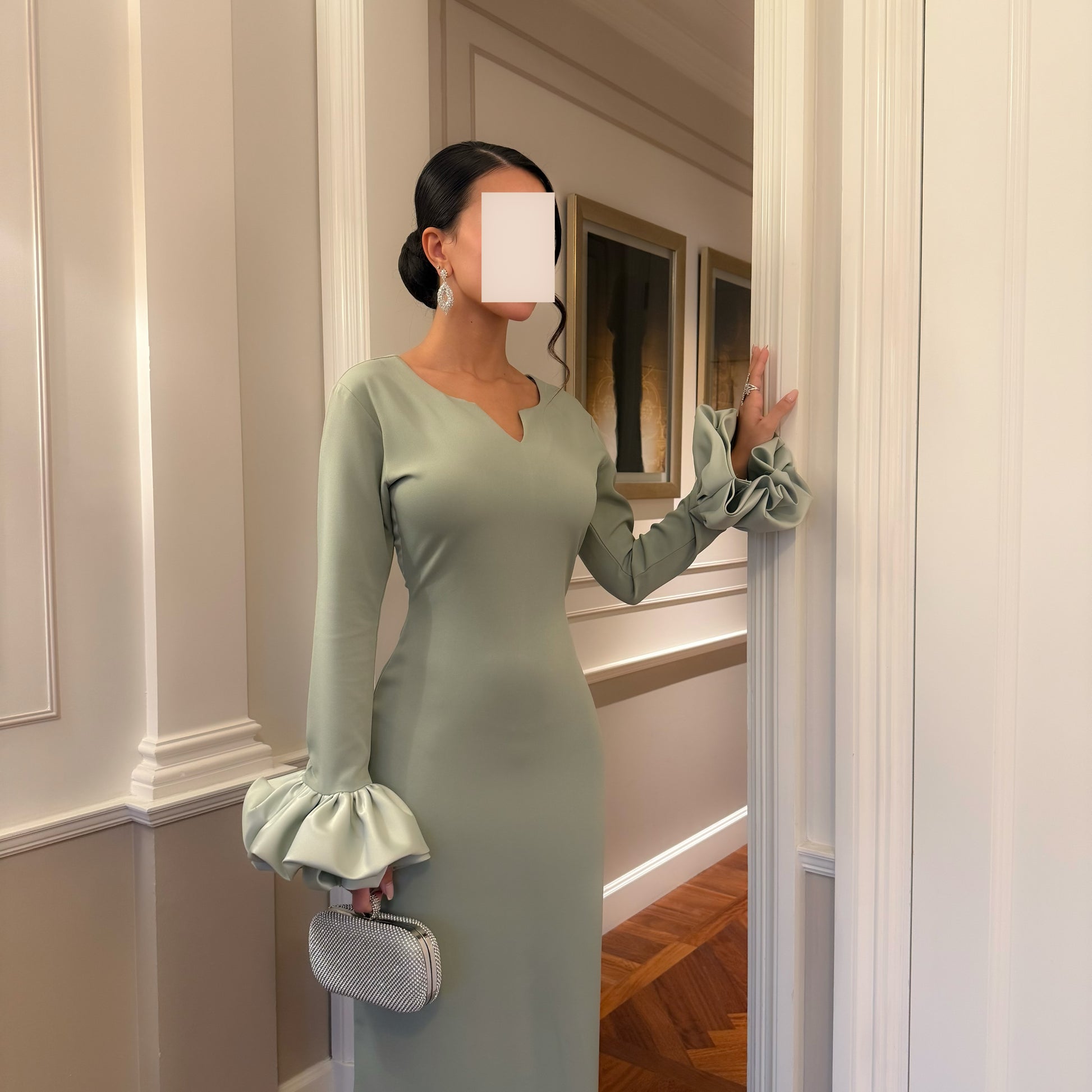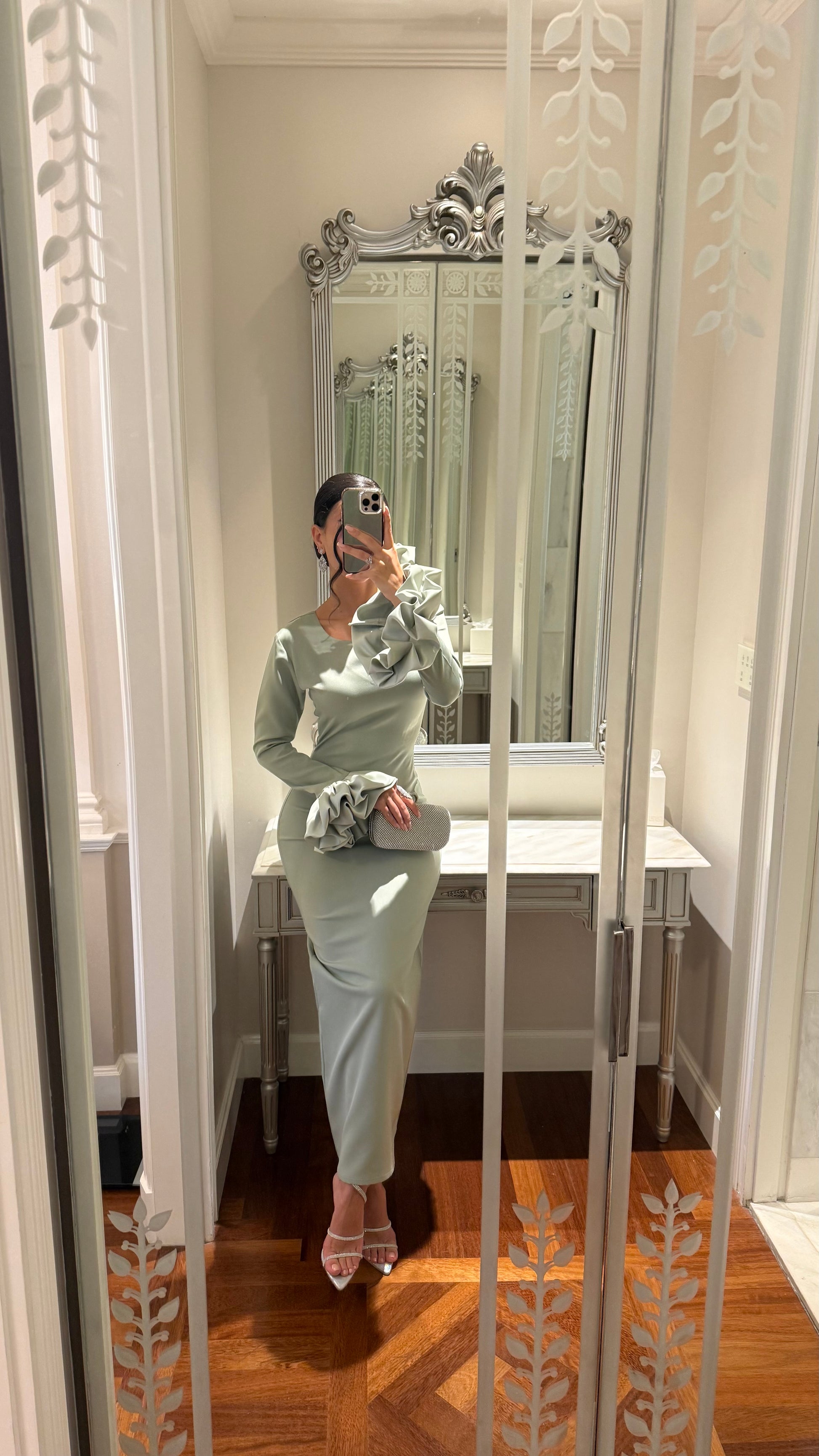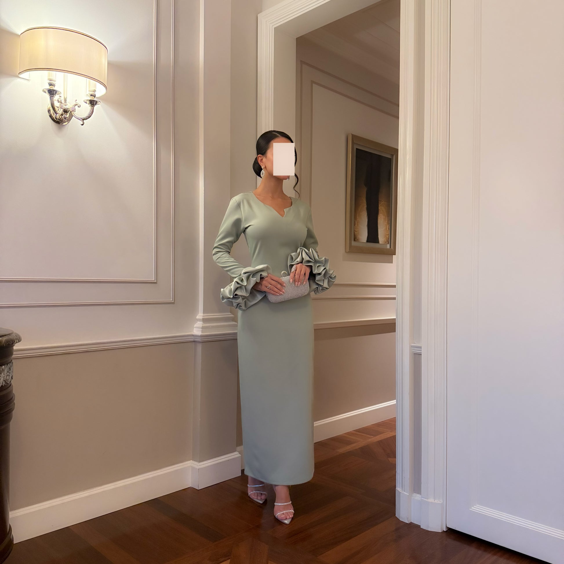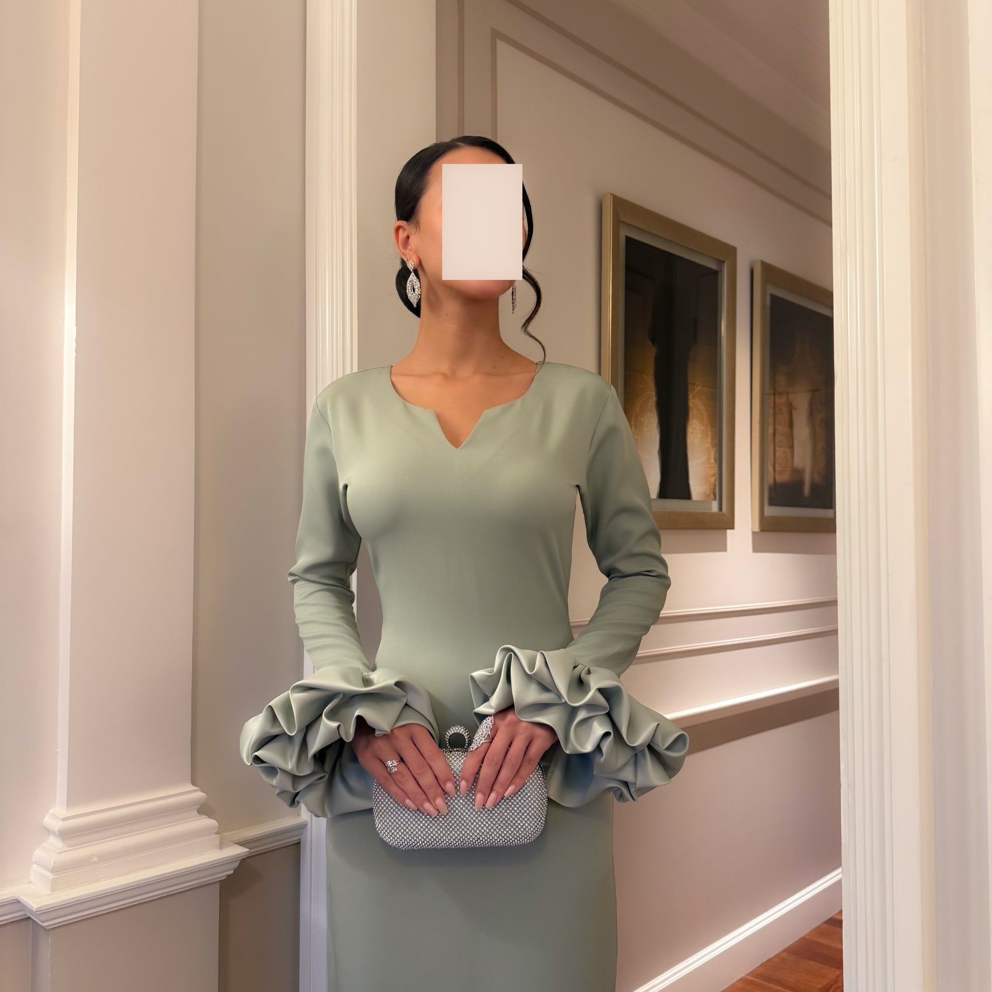 فستان طويل أنيق بقَصّة خصر ناعمة يُبرز خطوط الجسم بانسيابية، مطرّز بلون أخضر ماتشا هادئ يمنح إطلالة راقية ومتجددة. يتميّز بأكمام طويلة تنتهي بتفاصيل كشكش واسعة تضيف حركة وحيوية خفيفة مع كلّ حركة